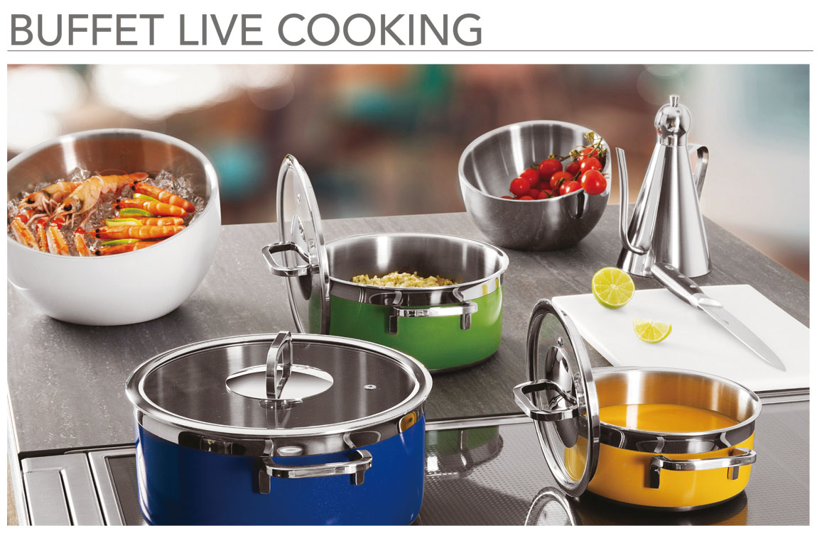 熱伝導にすぐれたステン、アルミ、ステンの3層構造で、底部から渕にに至るまで、素早く熱を均一に分散させます。IH、ガス、インダクション、あらゆるタイプの調理器に対応します。本体の材質は、18-10ステンレススチールです。各種カラーは、ウィットフォード技術のコーティングによって、あざやかな色彩を保ち、変色、耐摩耗性にすぐれています。蒸気抜き穴のついたガラス蓋は、中身を見やすく、鍋の側面にひっかけることも出来、スマートかつ機能的に出来ています。温かいものを温かいままサービス出来るライブクッキングパンは、正にブッフェサービスの主役です。どの色をとっても、その存在感はゲストに強く印象付けるでしょう。